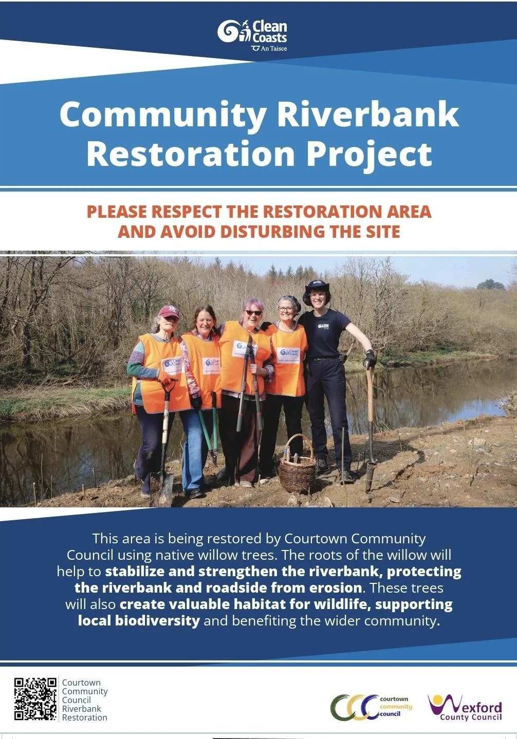 Courtown Community Council saw this as an ideal opportunity to undertake a community ripearian riverbank restoration project. We consulted with several experts and under the guidance of Clean Coast’s Area Officer - Roisin and Clean Coast’s Biodiversity Officer - Liane, we took cuttings from established willow trees along the same river and planted them along the eroded section. Community-led activities like this can make a real difference, have a positive impact in protecting our waterways, and promote local guardianship of our natural habitats.